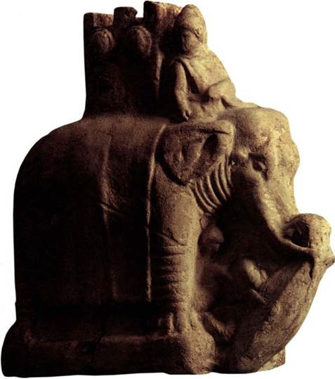 This terracotta statuette depicts an Indian elephant in the service of one of the Hellenistic kingdoms. A tower is carried on the animal’s back hut no crewman is visible in it. The elephant itself, rather than the crew, was the main weapon, trampling down the enemy ranks and, as here, grasping soldiers with its trunk. The crew added to the force of the attack by throwing missiles, but their main role was to protect the elephant from enemy light infantrymen, whose missiles might wound or panic it. Polybius’ description of the battle of Raphia in 217 вс claims that elephants fought each other by butting their heads together and pushing. Once unbalanced and its trunk pushed aside, the opposing elephant would be gored by the victor’s tusks.