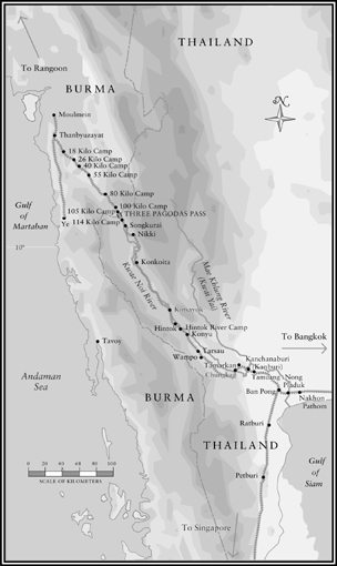 The solution to the quandary had been drawn up years earlier: a new railway link between Bangkok and Rangoon. In Burma, well-developed lines already ran from Moulmein south to Ye. In Thailand, tracks extended from Bangkok west to Ban Pong, then turned south to the Malayan border. A great gap, held firm by the mountain ridges and impassable jungle that straddled the border between Burma and Thailand, stood between the two systems. The Japanese calculated that if a link could be forged through the 258-mile-wide gap separating them, a war might be won.