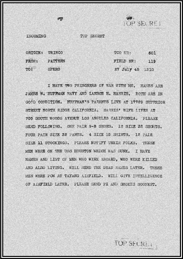Kandy responded the next day that it wanted the names of the Houston’s survivors, information about their condition, the location of prison camps, the total numbers of prisoners, how the Japanese guarded them, evidence of their cruelty, information about their attitudes toward war, specific conversations between POWs and guards, how the fall of Okinawa was influencing Japanese treatment of POWs, and how enemy morale might be lowered through propaganda.