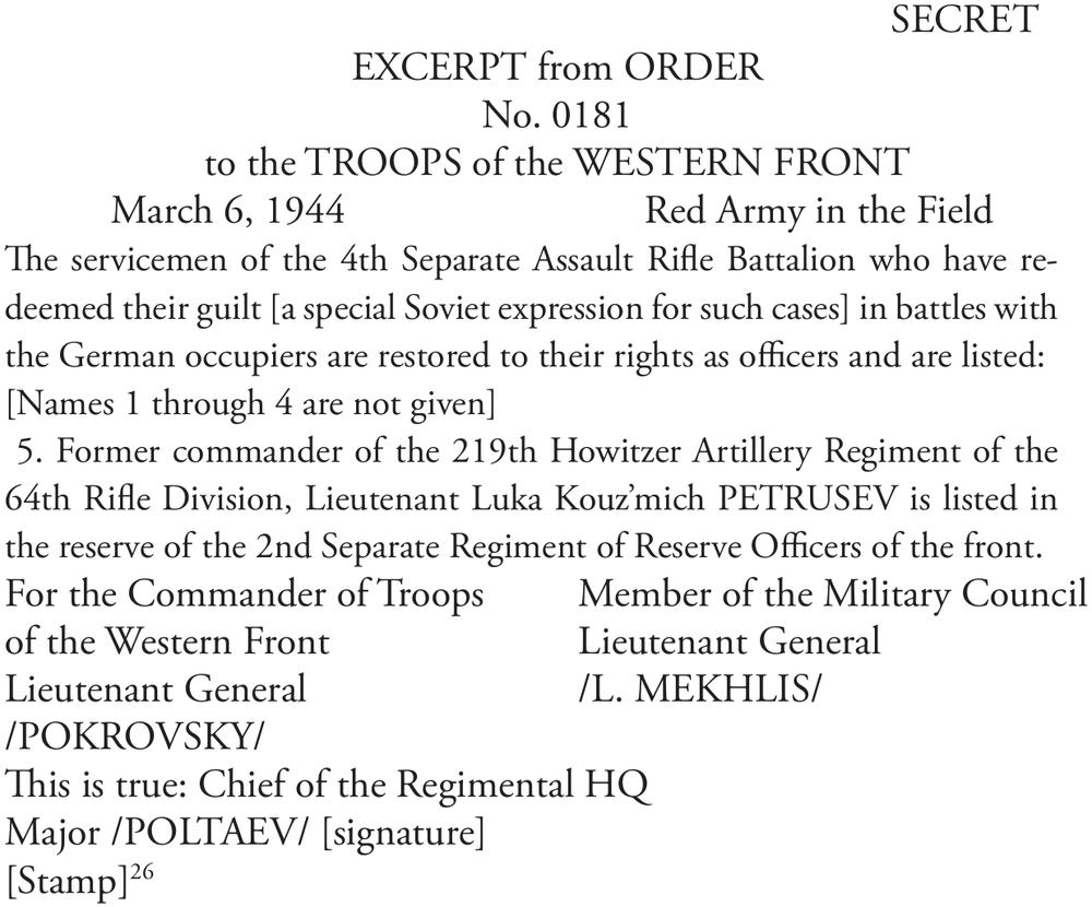 30. NKO Order No. 227, dated July 28, 1942. Document No. 1027, in Organy gosudarstvennoi bezopasnosti, 3 (2), 76–80. Additionally, GKO Order No. 298 entitled ‘On penal detachments’, dated September 28, 1942, in Skrytaya pravda voiny, 359–65.