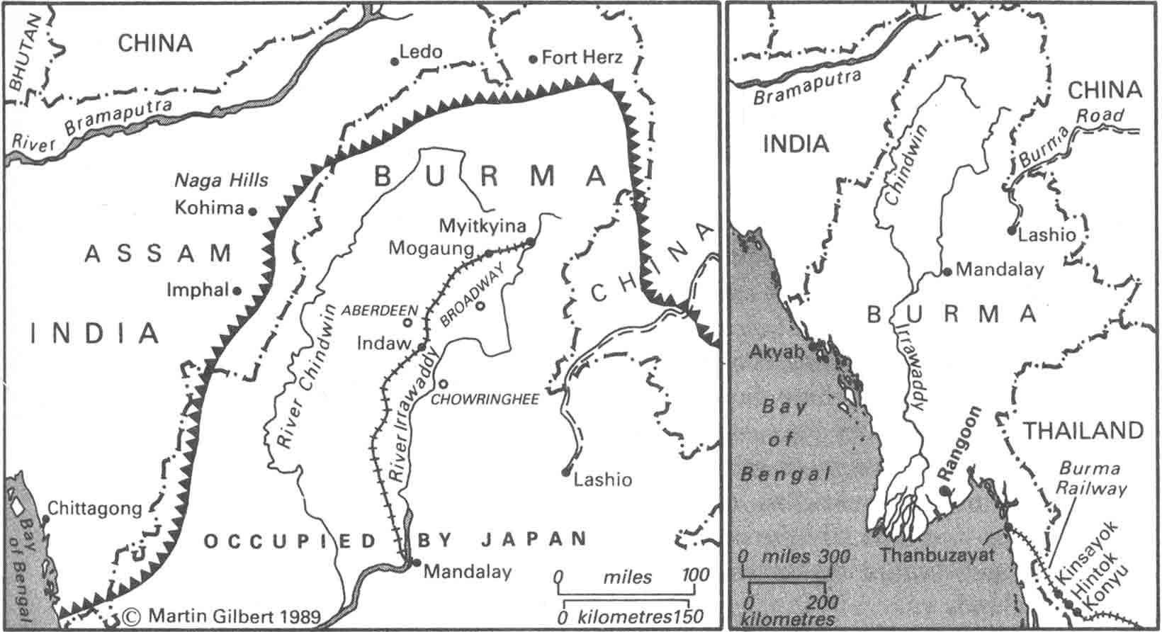 More than nine thousand officers and men were behind the Japanese lines in Burma by early April. These glider-borne forces were then joined by a fourth Chindit brigade, which had set off early in February, marching overland from the Naga Hills, across precipitous, six-thousand-feet mountain ranges, and across the Chindwin river. Two more land forces, one of American and Chinese troops, the other of Gurkhas and Kachins, were at the same time making their way through upper Burma, from Ledo and Fort Herz respectively towards Mogaung and Myitkyina. ‘We have inflicted a complete surprise on the enemy,’ Wingate told his men when the landings were done. ‘All our columns are inside the enemy’s guts. The time has come to reap the fruit of the advantage we have gained.’